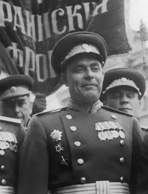 Дважды Герой Советского Союза маршал И. С. Конев во главе знаменной группы сводного полка 1-го Украинского фронта на Параде Победы.