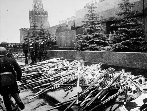 Появилась группа солдат, которые несли 200 опущенных знамён и штандартов разгромленных немецких войск. Они бросили знамена на деревянные помосты у Мавзолея. Первым было брошено древко штандарта части «Лейбштандарт СС Адольф Гитлер». Трибуны взорвались аплодисментами. Это был полный священного смысла акт, своего рода священнодействие. Символы гитлеровской Германии, а значит и «гитлеровского Евросоюза», были повержены.
