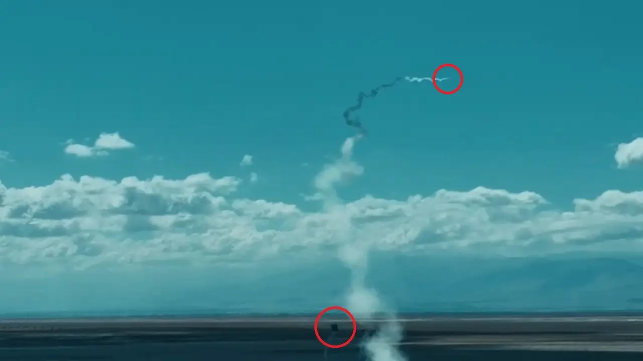 Ракета (помечена кружком) уходит в сторону от позиции КОЭП (кружок внизу)
