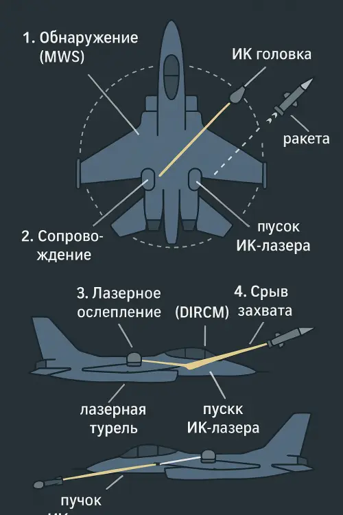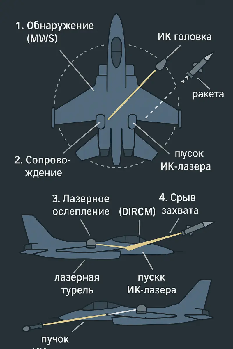 Так, при помощи средств РЭБ летательный аппарат должен будет мешать работе радиолокаторов противника и радиолокационных ГСН ракет. В свою очередь, ЛТЦ и лазерные БКО возьмут на себя противодействие ракетам с инфракрасным наведением. Ложные цели должны «отвлекать» ракету от реальной цели, а боевой лазер будет подавлять её или выводить из строя.