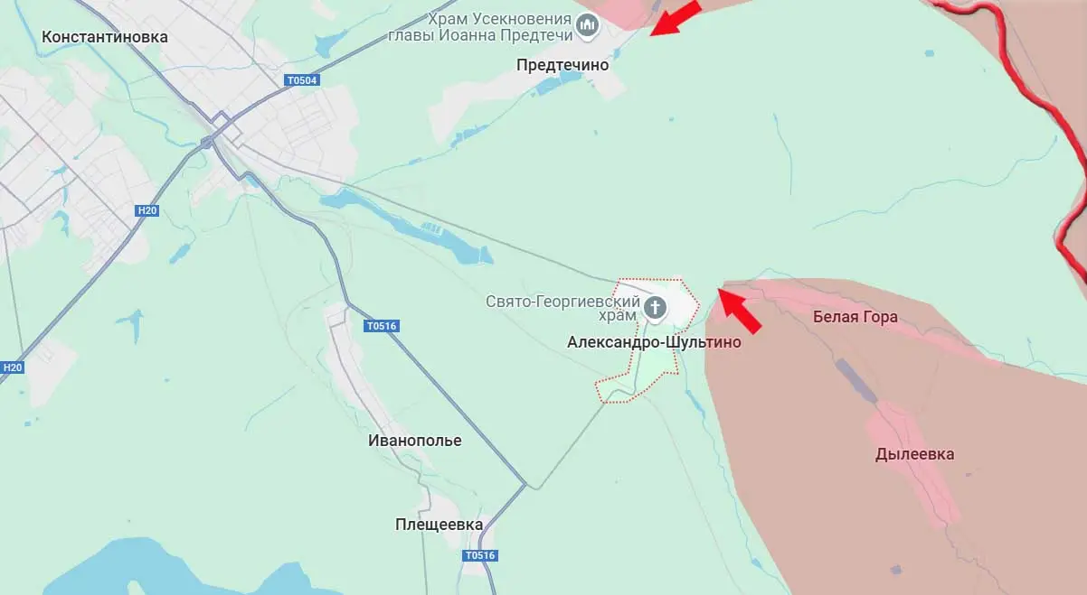 С продвижением к Александро-Шультино в полукольце оказались подразделения ВСУ севернее Белой Горы и юго-восточнее Предтечино. Эти позиции противник удерживает за собой, чтобы контролировать хотя бы небольшой участок дороги Горловка – Часов Яр, пытаясь воспрепятствовать её использованию российскими войсками. Часть этой дороги помечена на карте красным цветом.