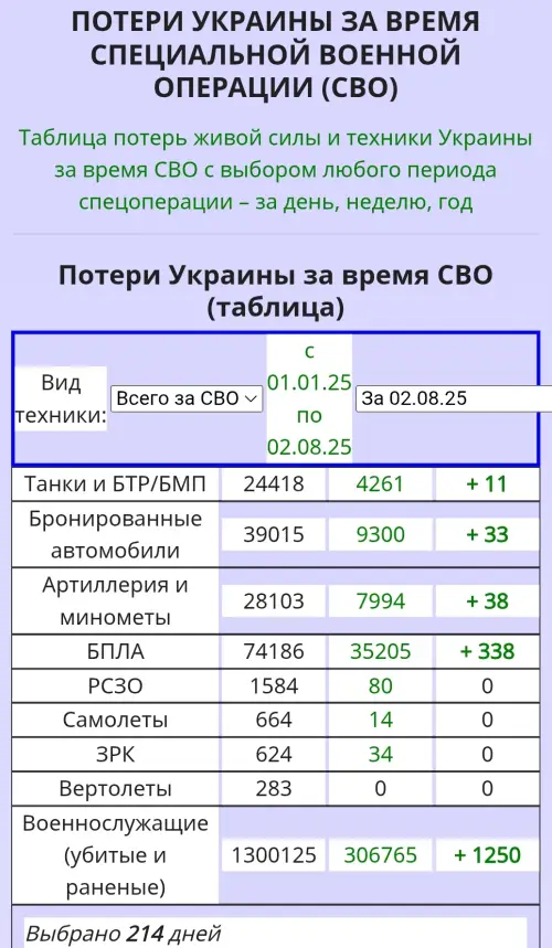 Сегодня англосаксонские источники перестали печатать статистику по потерям украинской стороны, ссылаясь на то, что это деморализует украинскую армию (нуландский институт изучения войны), а старые ссылки на оригиналы статей по этой тематике не работают, так как всё было зачищено... Из того что я сейчас смог сходу найти это наша ссылка на турецко-израильский источник от 23 года (https://mo.tsargrad.tv/news/izrailskaja-razvedka-ocenila-poteri-ukrainy-i-rossii-v-hode-konflikta-10-k-1_720458) и на Иносми от 25-го (https://inosmi.ru/20250324/poteri_vsu-272321927.html) с ссылкой на польский оригинал (https://myslpolska.info/2025/03/21/jakie-sa-realne-straty-armii-ukrainskiej/)... Но по моему это по любому точнее и надёжней чем цифры о наших потерях из уст Рютте или Трампа... Реальные же цифры мы либо узнаем только после окончания войны, либо не узнаем никогда... hi