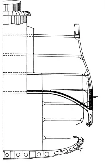 В этом случае нижнюю угольную яму буквально захлестнуло бы потоком воды, которого никакими деревянными щитами остановить было бы невозможно. Не будем забывать, что верхняя кромка броневого пояса «Осляби» в носовой его части в самом лучшем случае возвышалась над водой сантиметров на 10, а скорее всего – находилась где-то на уровне моря. То есть при таком повреждении броненосец получил бы большую подводную пробоину, и угольная яма на скосе сразу же наполнилась водой.