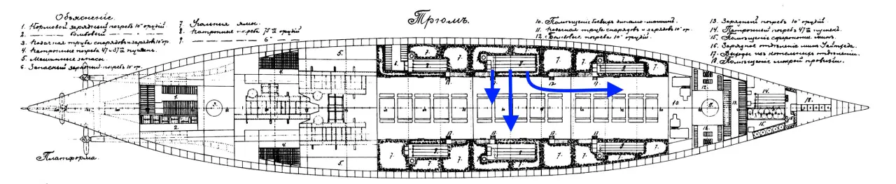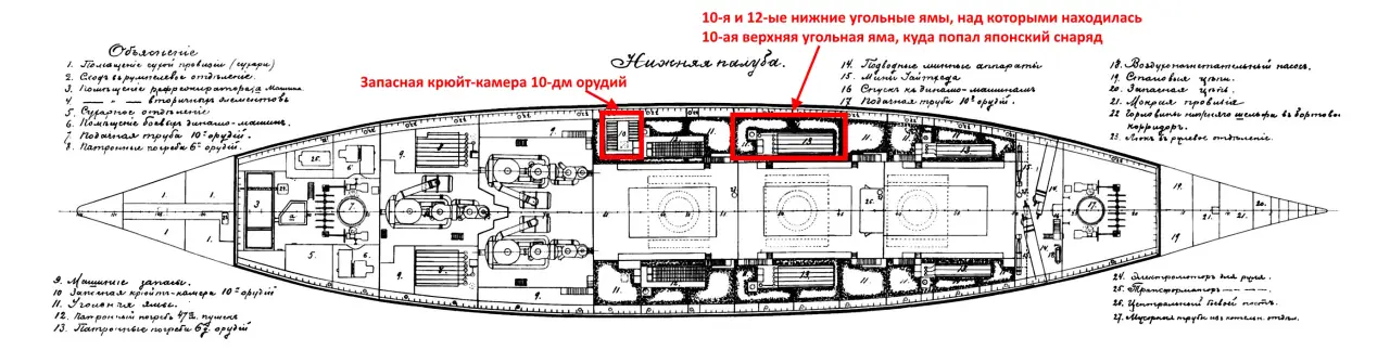 Теперь по поводу воды в запасной крюйт-камере. Действительно, между 10-й угольной ямой и этой камерой расстояние весьма велико, что по жилой палубе, что по нижней. Подобное распространение воды трудно объяснить боевыми повреждениями 10-й угольной ямы.