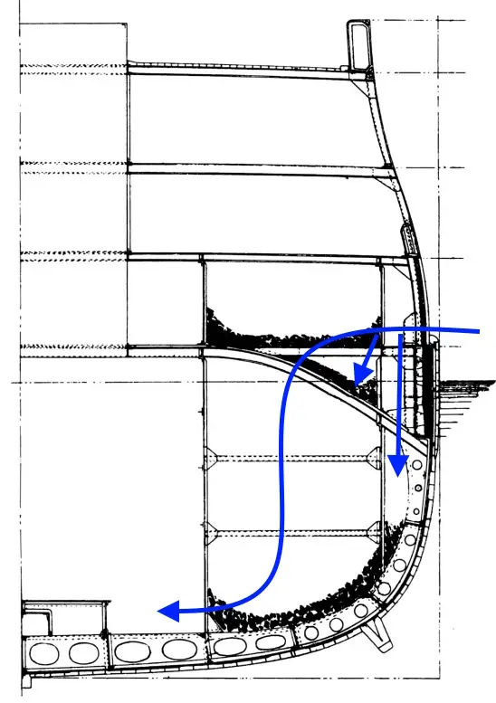 Но дальше — вода отыскивает лазейку сквозь скос. Ну… пусть даже и это еще нормально. Через «неплотно задраенные горловины» вода попадает в 10-ю нижнюю и 12-ю угольные ямы. Хорошо, но уж тут-то распространение воды должно быть остановлено? Ан нет — вода течет себе дальше, прямо в котельное отделение.