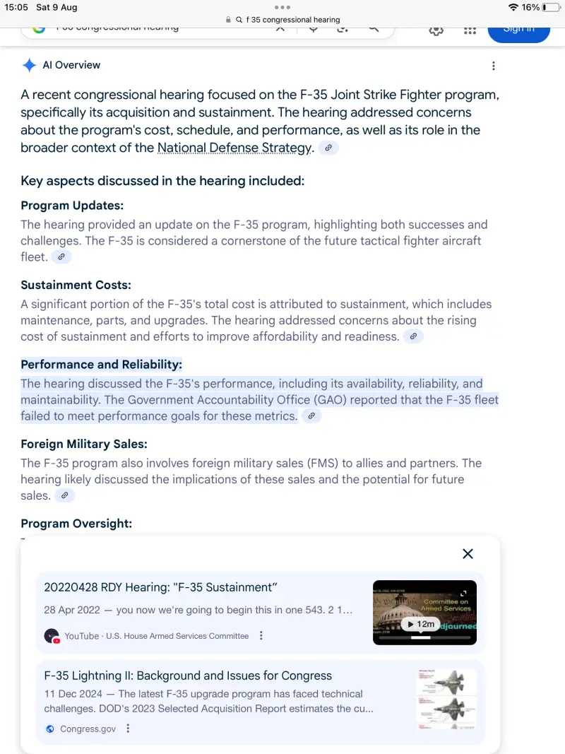 Кроме того, двигатели F-35 регулярно перегреваются, несмотря на постоянные усилия Министерства обороны по их модернизации. Эти проблемы с перегревом ограничивают продолжительность полётов на высокой скорости и приводят к увеличению расходов на техническое обслуживание и простоям. В другом отчёте Главного бюджетно-контрольного управления, на этот раз за 2024 год, показано, что флот F-35 достигал целевых показателей готовности только в 30% случаев.