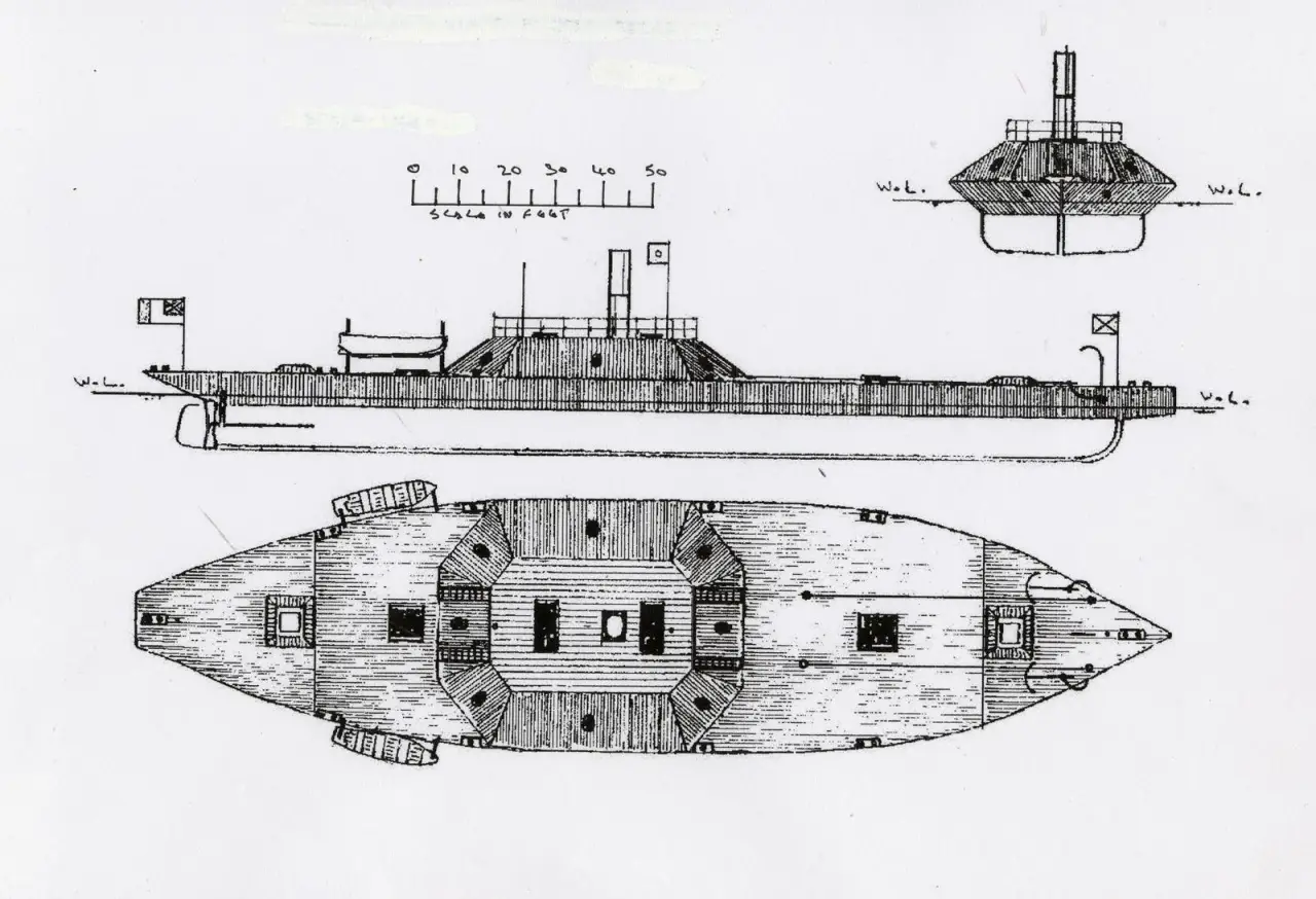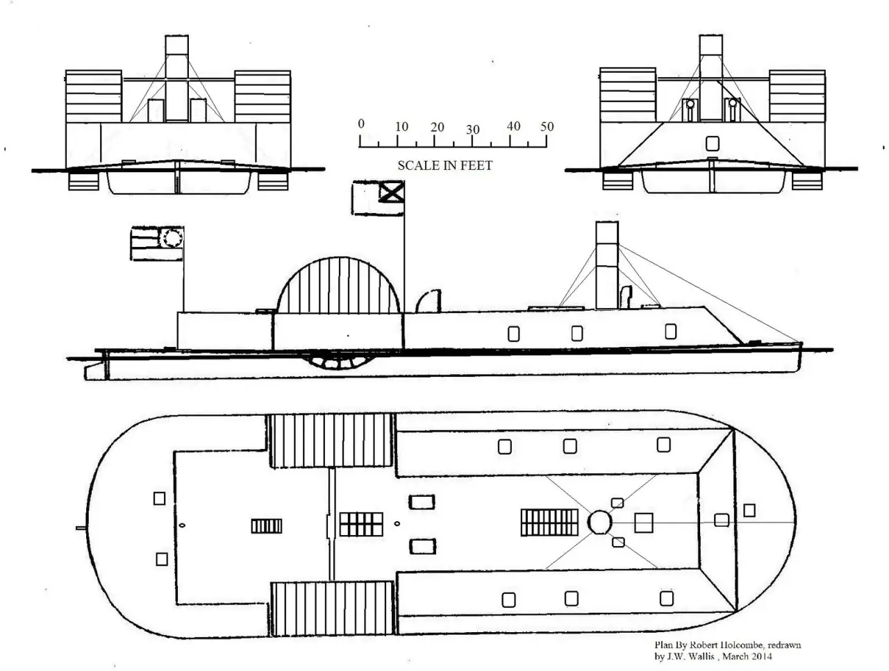 Длина его составляла 48,82 метра, ширина — 11 метров, и осадка — до 2,59 метров. Полное водоизмещение броненосца было 677 тонн. Он был полностью построен из железа, без какого-либо применения деревянных конструкций; корпус его был собран из пяти больших железных отсеков, произведённых отдельно и собранных на верфи. Сами орудия были типичными гладкоствольными дульнозарядными орудиями Дальгрена, стрелявшими ядром весом до 75 кг, фугасной бомбой весом до 70 кг, шрапнелью и разного размера картечью. Их дальность составляла до 3650 метров при угле возвышения до 15 градусов. Для того времени это были достаточно мощные орудия, способные (с небольшой дистанции) пробивать наклонную 100-миллиметровую броню конфедеративных броненосцев. Так что очень даже оригинальных кораблей хватало и у южан, и у северян!