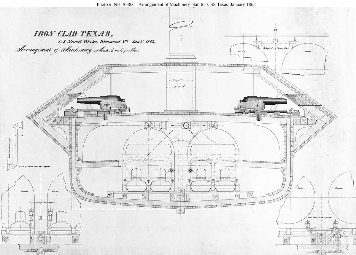 Разрез броненосца «Техас». Глядя на него, становится понятно, почему внутри каземата стояла жуткая жара. Вентиляция была… естественной, и она не справлялась жаром от двух паровых котлов!