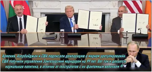 Накануне в Белом доме было подписано мирное соглашение между Арменией и Азербайджаном. В присутствии Трампа свои подписи на соглашении поставили Пашинян и Алиев.