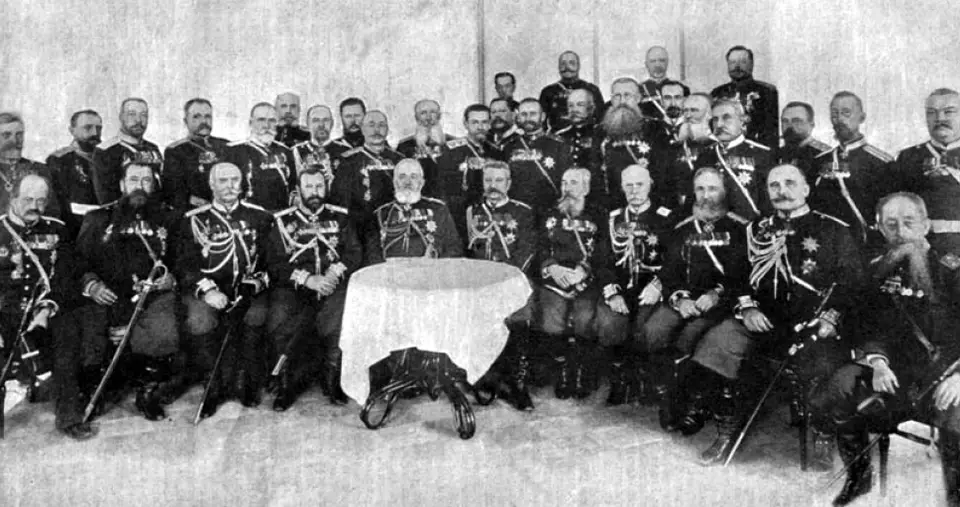 Управляющий военным министерством А. Н. Куропаткин (сидит четвертый слева) среди участников Хивинского похода 1873 года. Опубликованная журналом «Нива» (№ 24, 1898 г.) фотография сделана во время торжественного обеда 30 мая 1898 г.