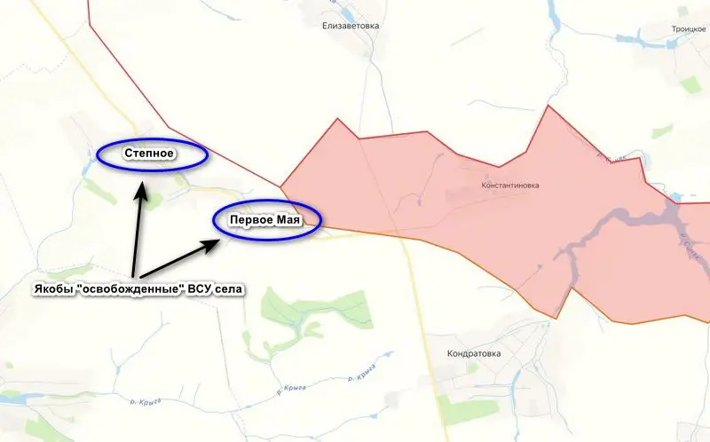 Генштаб ВСУ заявил о зачистке от штурмовых подразделений ВС РФ населенных пунктов Степное и Новоконстантиновка (Первое Мая) на границе с Россией. Однако, как оказалось, эти села вообще ни разу не фигурировали в военных сводках, нет никакой информации о заходе в них российских войск и тем более захвате. Также эти населенные пункты никогда не упоминались другими украинскими военными пабликами, включая Deep State, который отражает всю объективную информацию, пусть и с задержкой в несколько дней.