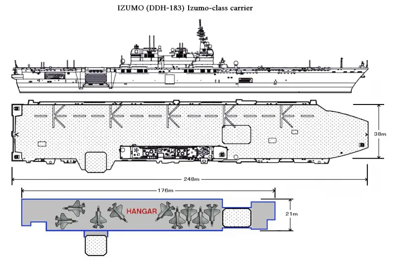 Однако это не меняет того факта, что «Идзумо» и «Кага» — корабли длиной 248 метров и шириной 38 метров, по своим размерам очень похожие на авианосцы «Сёкаку» и «Дзуйкаку», атаковавшие Перл-Харбор в 1941 году. Кроме того, в 2021 году были проведены испытательные посадки самолёта F-35B Корпуса морской пехоты США.