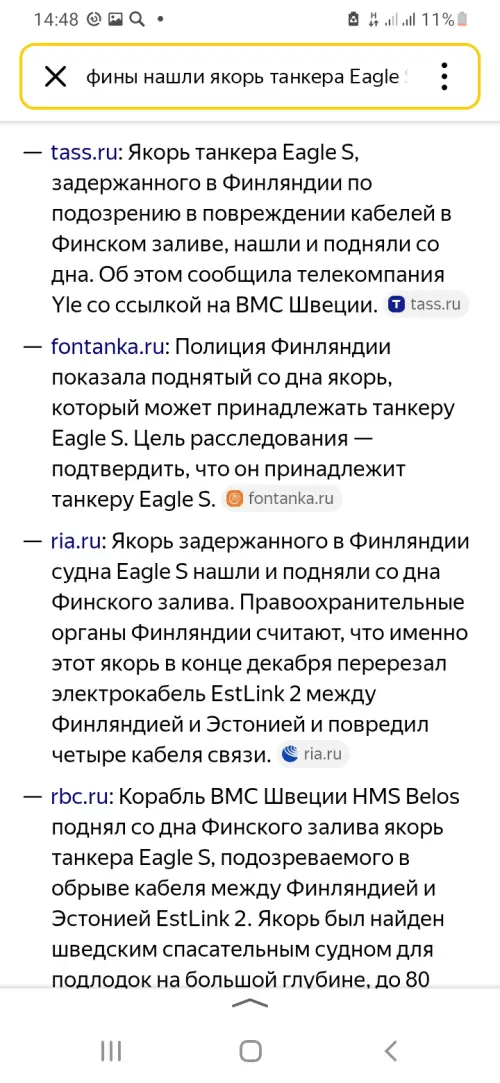Тогда полиция и пограничная служба Финляндии задержали нефтяной танкер Eagle S, следовавший под флагом Островов Кука из российского порта Усть-Луга, по подозрению в причастности к повреждению кабелей. Арест с танкера был снят 2 марта. Позднее газета Postimees сообщила, что эстонские компании уведомили о повреждении трех кабелей между Финляндией и Эстонией. По другим данным, всего было повреждено пять кабелей.