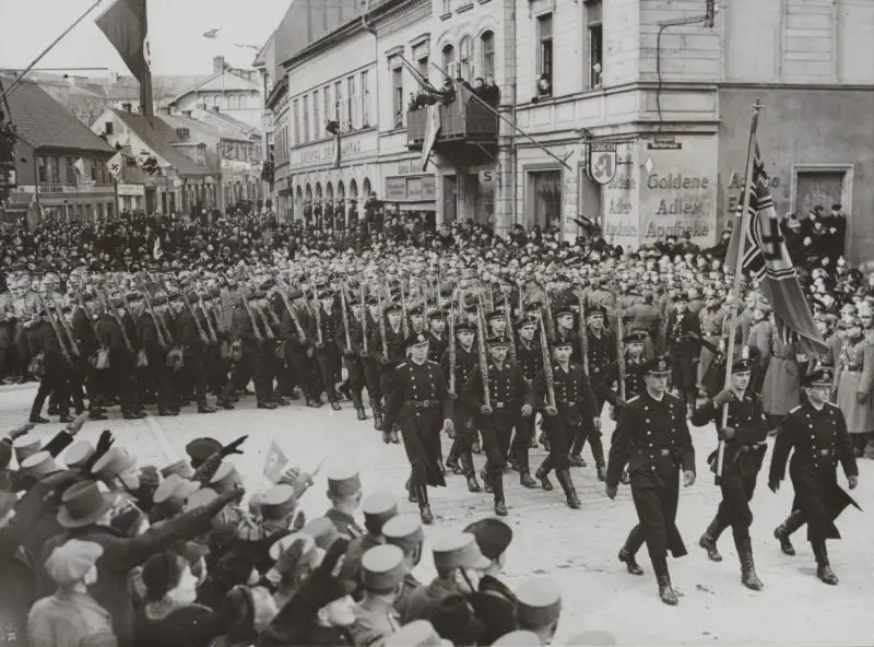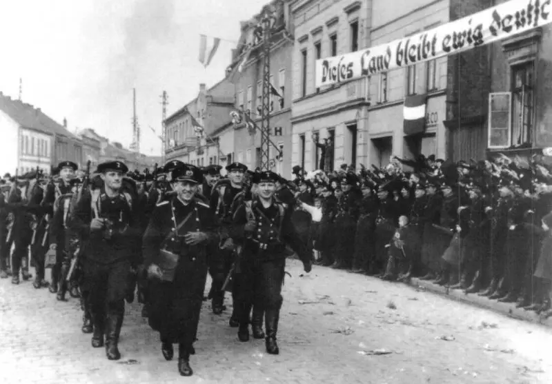 Жители Клайпеды (Мемеля) радостно приветствуют немецких моряков
