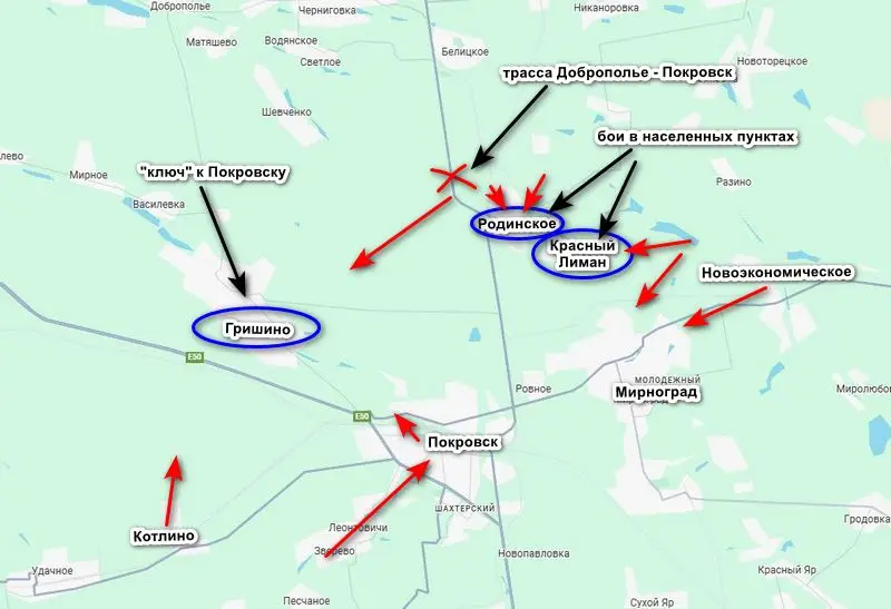 Бои в Родинском, перерезание основной трассы снабжения гарнизона Доброполье — Покровск и выход российских войск в район Гришино фактически лишили украинскую группировку возможности вывести войска из Покровска (Красноармейска). Как сообщил советник главы ДНР Игорь Кимаковский, у противника отсутствует возможность проводить эвакуацию по дорогам, поскольку они или физически перерезаны, или находятся под огневым контролем. Попытки уйти через поля тоже не увенчиваются для противника успехом, поскольку российские дроны и артиллерия достают и там.
