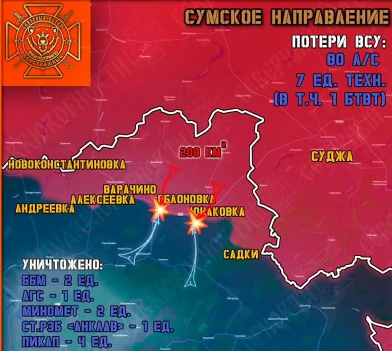 В течение минувших суток на Сумском направлении снизилась интенсивность боевых действий, но в Юнаковке, где ВС РФ двигаются вперед, бои не прекращаются с прежним накалом. Противник проводит перегруппировку и восстанавливает боеспособность штурмовых групп, готовясь к возобновлению атак, пишет телеграм-канал «Северный ветер».