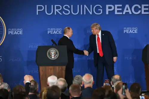 Начало встречи на фоне баннера «Стремление к миру» (на английском языке) выдалось бурным – в первую очередь из-за попыток американских (и не только) журналистов перекричать друг друга в попытке задать вопрос. Среди выкриков конкретные вопросы разобрать крайне сложно. Однако несколько кричащих в унисон репортёров пытались спросить о том, «закончится ли после этой встречи война на Украине?»