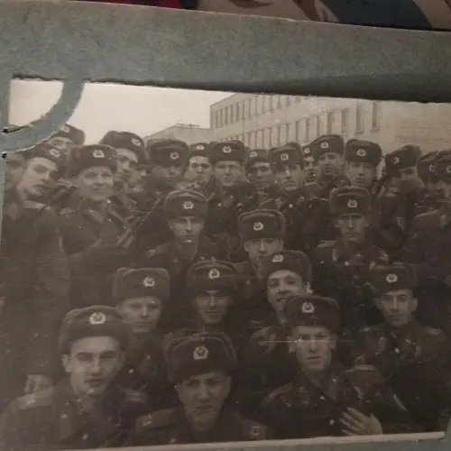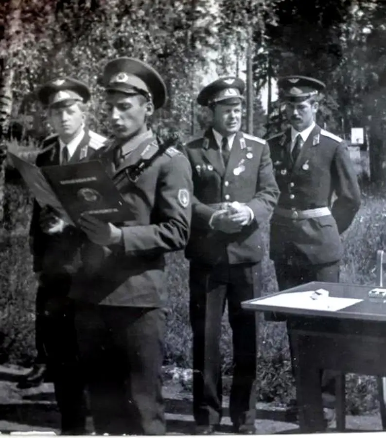 Лето 1979 года. 7-я парашютно-десантная рота 350-го гвардейского парашютно-десантного полка. Фото после принятия присяги молодым пополнением – на фотографии в основном именно пополнение, прибывшее из учебного центра дивизии. В центре стоит командир роты, гвардии старший лейтенант Валерий Евгеньевич Евтухович; за ним старшина роты, гвардии прапорщик Александр Адамцевич. Сидят: второй слева сержант Владимир Кузнецов, второй справа сержант Николай Сакович, остальные в ряду – молодые бойцы