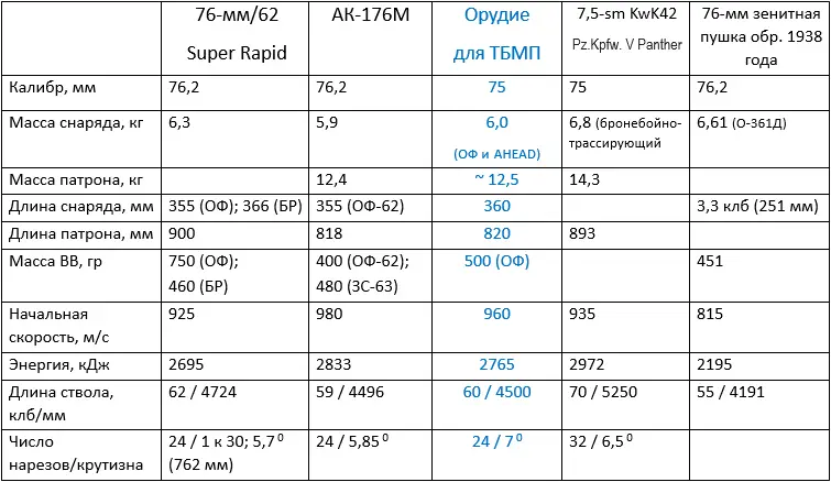 С лёгкой подачи политолога Соловьёва В.Р. стал популярен тезис о том, что надо воевать современным оружием, а не легендарным. Корабельные артиллерийские установки из таблицы вполне себе современны и востребованы флотами разных стран, в будущем могут получить и статус легендарных. А вот советская зенитная пушка и немецкий танк давно уже стали легендарными. В таблицу же они объединены как образцы вооружения калибра 75-76 миллиметров с выдающимися характеристиками для своего времени. И наша попытка создания орудия для ТБМП должна впитать всё лучшее из мирового опыта.