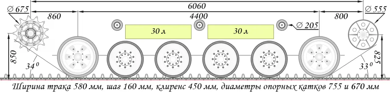 В качестве движителя отлично подойдёт гусеница 172.55.010сб-2 с повышенными ресурсом и сцепными свойствами, параллельными резинометаллическими шарнирами (РМШ), со штампованными траками, разработанная в ходе ОКР «Рамка-99» (БМПТ). Так как ТБМП будет значительно легче любого из двух основных танков, то разумная экономия веса должна только приветствоваться. В качестве первого и шестого опорных катков с каждого борта используем обычные опорные катки (не усиленные) от Т-90 диаметром 755 миллиметров и весом по 194 килограмма. На позициях 2-3-4-5 установим опорные катки от Т-80 диаметром 670 мм и весом по 120 кг. Столь необычное сочетание позволяет немного облегчить общий вес ходовой части и несколько снизить сопротивление качению гусеничного движителя в целом путём увеличения диаметра первых и последних опорных катков, как на английском танке «Валентайн».