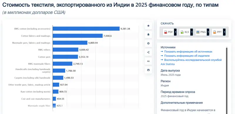Для справки: Индия в 2024 году экспортировала текстиля и одежды на огромные 800 млрд долларов (данные индийских СМИ). Теперь индийский текстиль не выдерживает конкуренции на американском рынке из-за тех самых пошлин Трампа.