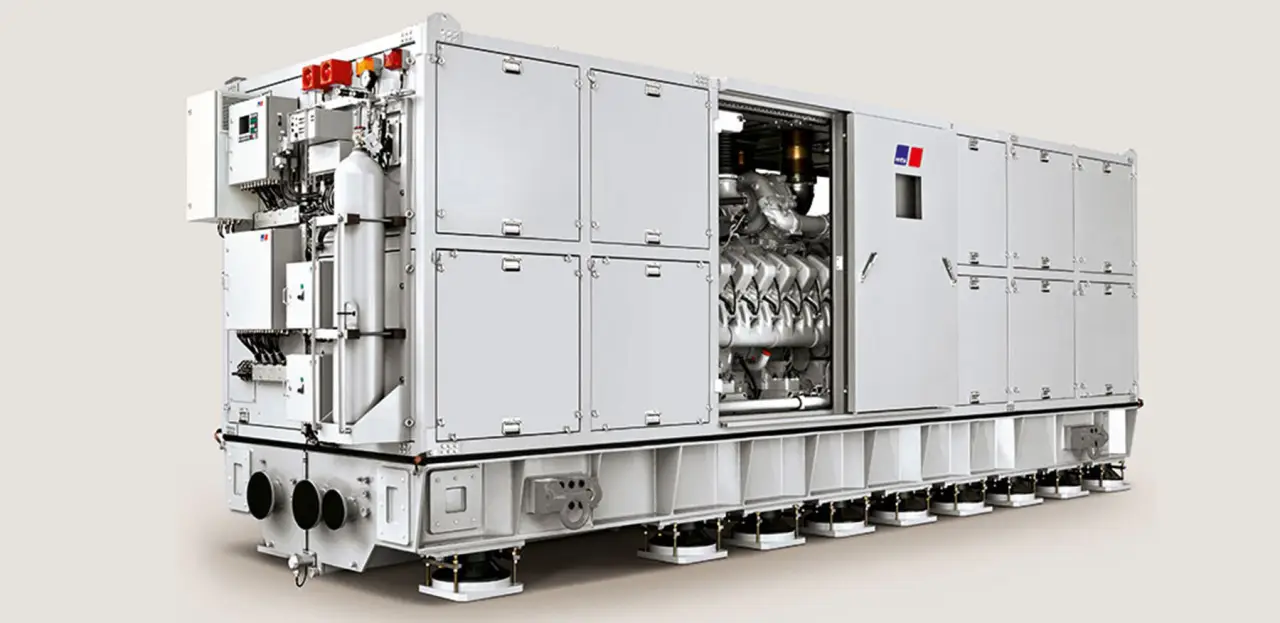 Дизель-генератор в акустическом кожухе и снятыми панелями доступа на выставке DSEI 2019. Слева дизель, справа виден генератор.