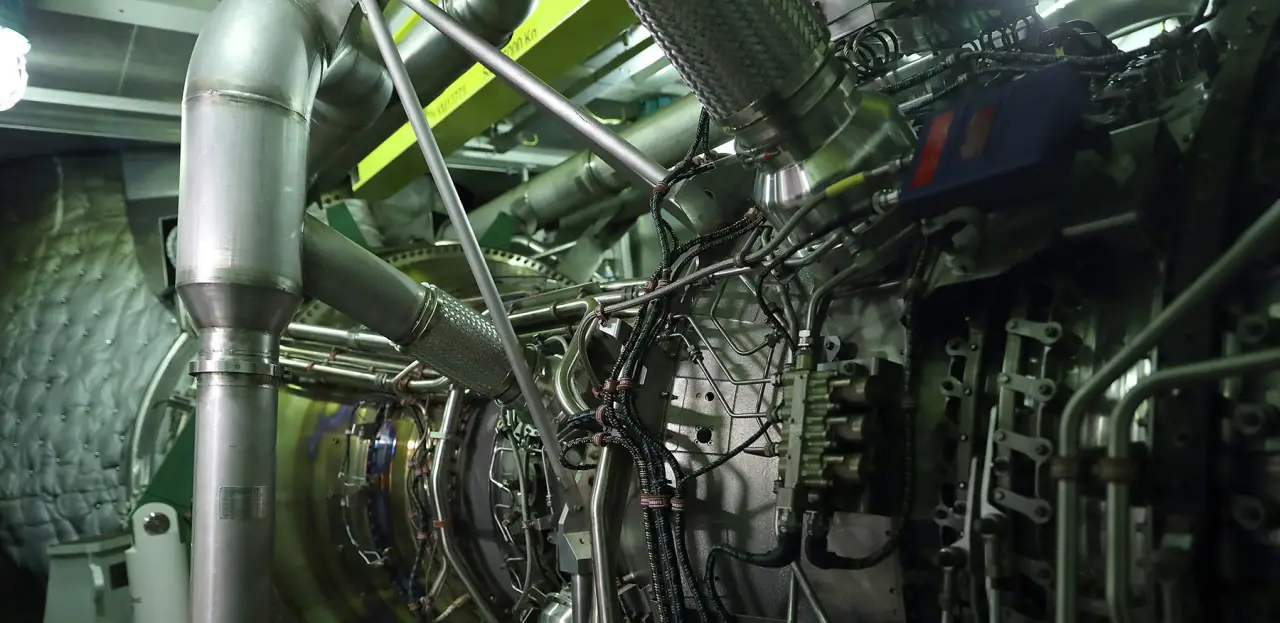 На этом снимке «живой» газотурбинный двигатель на основе турбины МТ30 авианосца HMS Prince of Wales. ГТД включает в себя корпус и вспомогательное оборудование, и в сборе весит около 30 тонн. В виде единого узла вместе с опорным фундаментом он может быть установлен с помощью одного подъемника (желтая рельса вверху)