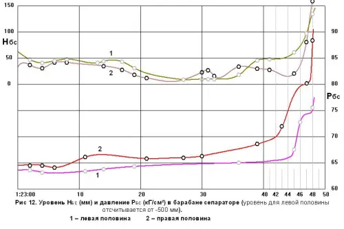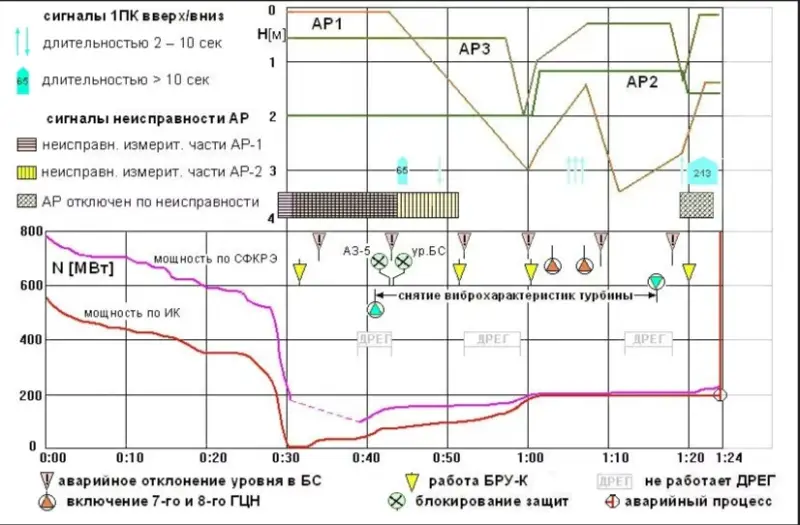 По мнению Дмитриева, и согласно данным Н. Карпана, в период с 00ч 43м по 01ч 00м реактор работал нестабильно, так как имелись аварийные сигналы по отклонению уровня воды в БС и срабатывание БРУК-К (превышение давления пара).