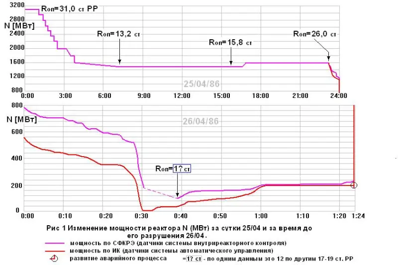 После ошибок СИУРа в управлении реактором или и/в результате ксенонового отравления, либо уменьшения мощности для проведения виброиспытаний, реактор глохнет. Мы это подробно разобрали в предшествующей статье. Существует крайне важная гипотеза возможности ксенонового отравления реактора, созданного как в результате планового снижения мощности на 50% накануне эксперимента, так и последующей задержки ее снижения из-за запрета Киевэнерго. Кратко напомним эти моменты.
