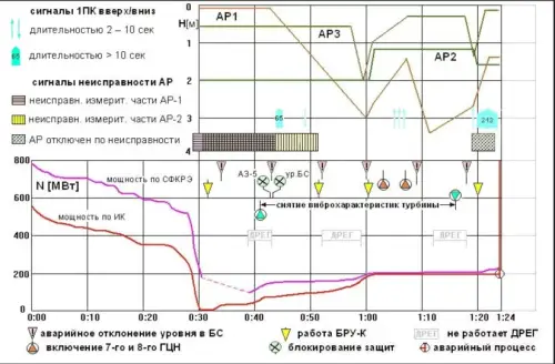 00ч 28м - отключен ЛАР, включен АР-1. По ВК отключился АР-1, не включился АР-2 по недопустимому разбалансу. Тепловая мощность реактора падает.