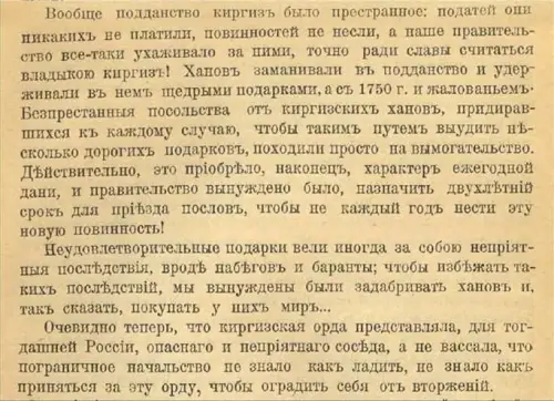 Влияние русское на торговлю рабами сказалось в трех наиболее выдающихся фактах: во-первых, вообще уменьшилось число рабов, потому что во всей присоединенной к России стране они сделались свободными; во-вторых, вообще уменьшился спрос на новых рабов, потому что во все эти новоприобретенные страны нет более сбыта их, а в такие города, как Ташкент, Ходжент, Самарканд и другие, сбыт их был немал; в-третьих, торговля эта значительно упала, уменьшилась в размере и во всех соседних варварских государствах Средней Азии по тому простому и не лишенному смысла предположению, что русские не сегодня-завтра могут пожаловать в каждый из них, и так как в каждом из них хорошо знают, что рабов русские немилосердно освобождают, то и все покупки и сделки этого рода принимают теперь малонадежный, неблагодарный вид.