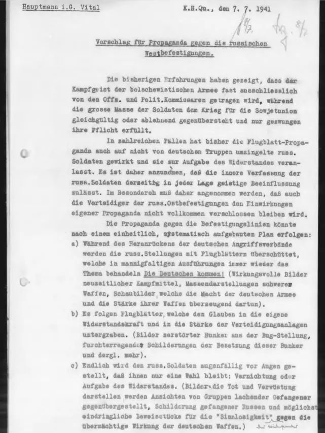 Отделам Ic принадлежат рекомендации по пропагандистским операциям против укрепрайонов. Они были подготовлены гауптманом Фиталем (гауптман — воинское звание младшего офицерского состава, соответствует капитанскому чину).