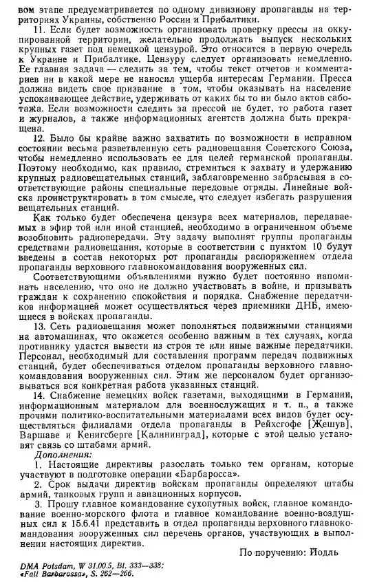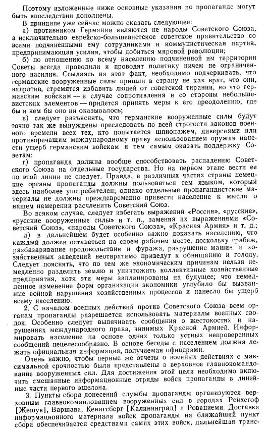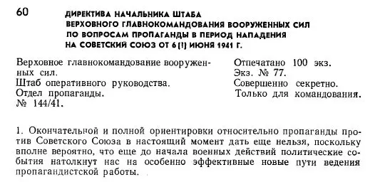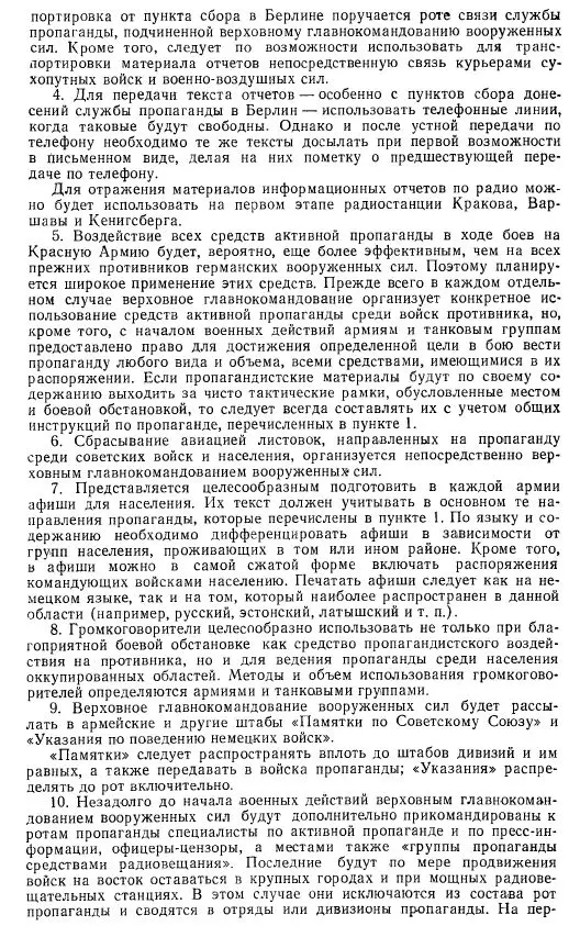 Далее привожу текст директивы «О применении пропаганды по плану «Барбаросса», перевод на русский. Архивный шифр оригинала директивы: ГА РФ. Ф. Р-7021. Оп. 148. Д. 208. Л. 26-30, 21-25.