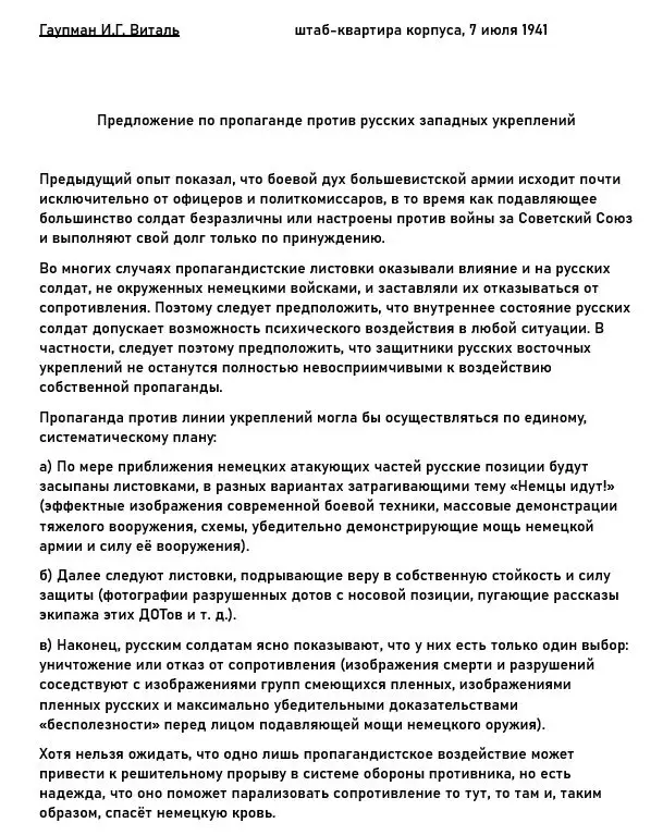 Таким образом, сначала ставилась задача внушить страх перед «непобедимой» немецкой армией, а далее подорвать веру солдат Красной Армии в надежность их укреплений.