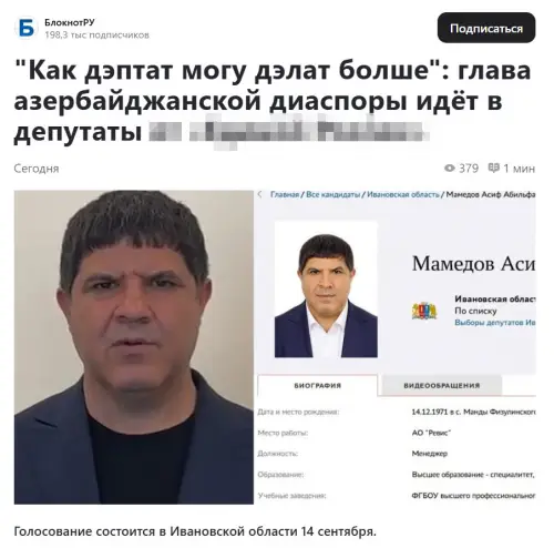 В Ивановской области в списке кандидатов от одной из партий на муниципальных выборах 14 сентября 2025 года оказался глава азербайджанской диаспоры региона Асифе Абильфат Оглы Мамедове. Агент Алиева нашёлся в неожиданном месте.