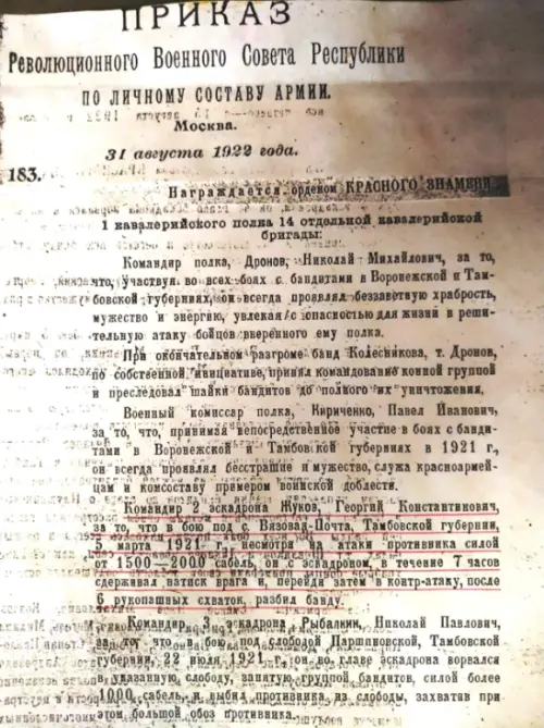Понятное дело, кто же хочет быть героем, воюя со своим народом. Даже у Г.К. Жукова в его мемуарах антоновскому мятежу на Тамбовщине посвящена целая глава, но про Кирсанов, где он был, воевал, и получил свою первую награду – орден Боевого Красного знамени, не написано, ни слова.