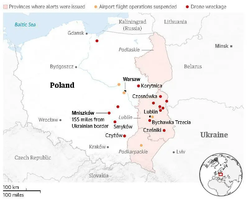 Варшава продолжает попытки по максимуму «разогнать» тему с налётом «десятков» российских дронов на польскую территорию. Так, власти страны опубликовали карту, на которой отмечены места, где якобы упали наши БПЛА.