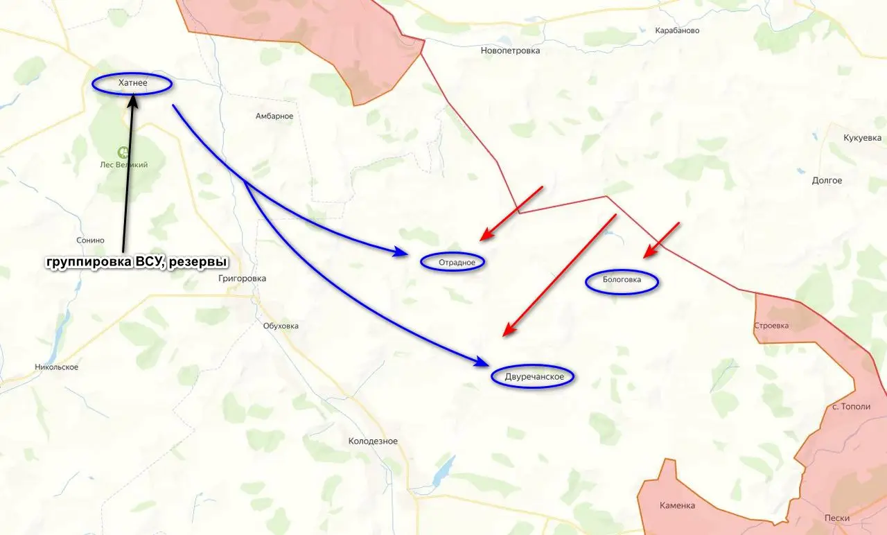 Противник уже отреагировал на действия ВС РФ, перебрасывая формирования на данный участок, в том числе и из-под Хатнего, где располагаются самые близкие к новому прорыву позиции ВСУ. Хотя в районе Хатнего у врага ситуация тоже очень сложная. Как пишет канал «Северный ветер», на участке Меловое-Хатнее штурмовики группировки «Север» продолжают наступление, за сутки общее продвижение составило порядка 500 м.