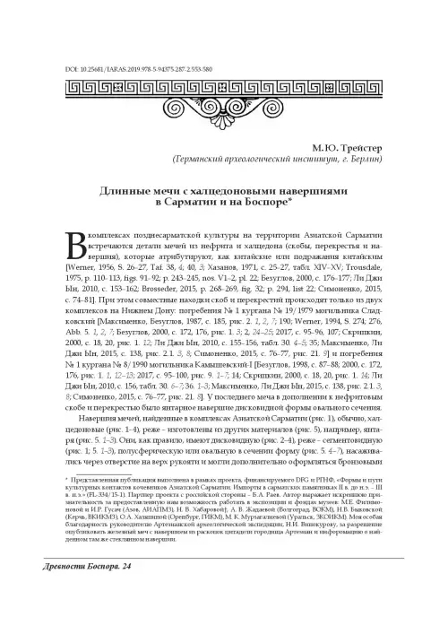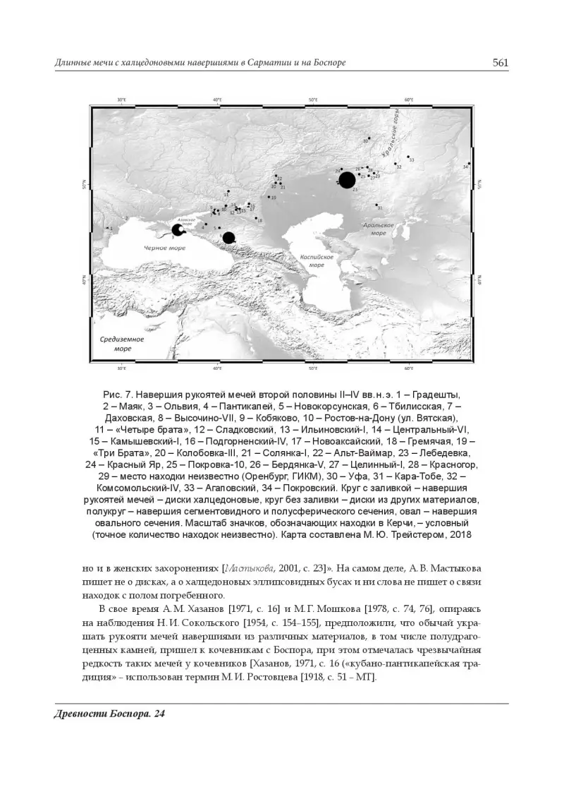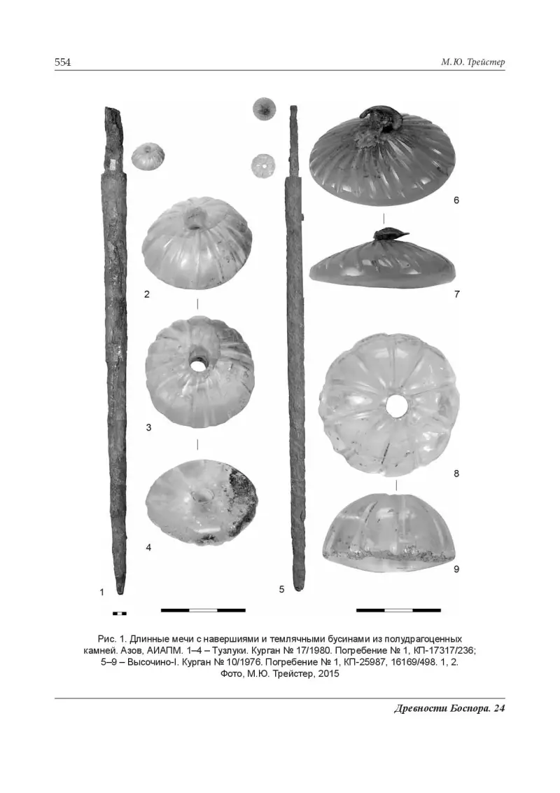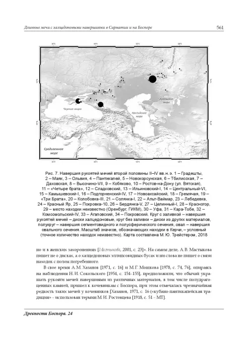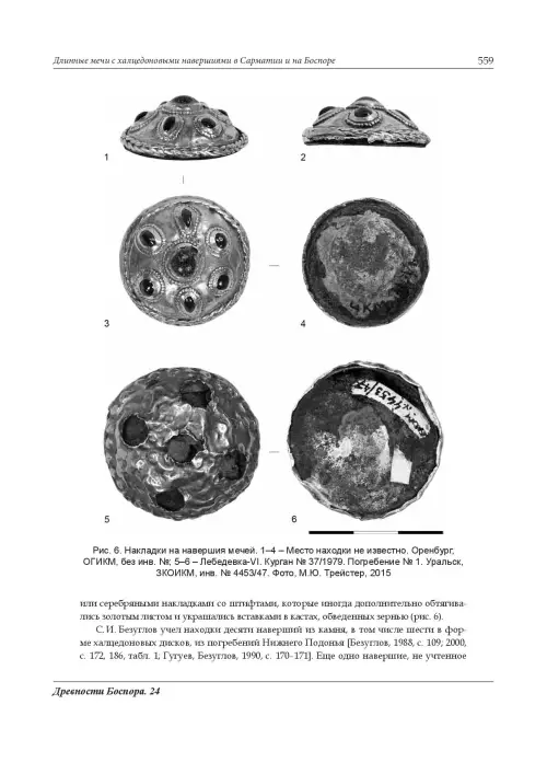 И вот прошли годы, и вышло так, что я оказался в гостях у нашего известного историка и реконструктора Михаила Горелика, и он показал мне реплику своего сарматского меча. Рукоятку его, лишенную всякого перекрестия, венчал диск из материала, напоминавшего бутылочное стекло, о чем я ему и сказал, а он мне ответил, что не было у него под руками халцедона, чтобы сделать точно такой же диск из камня. Тут я ему рассказал про диск из Варны, а он показал мне книгу, кажется, автора Смирнова, еще 1961 года издания, где были приведены черно-белые изображения сарматского оружия, в том числе и с характерного вида дисковыми каменными навершиями. Ведь сарматы — это не одно же племя, там было несколько племенных объединений, которых так называли, и вполне возможно, что навершия рукояток мечей у них были разными: у кого-то кольцевидное, у кого-то в форме бруска, а какие-то «сарматы» имели мечи с каменными дисковидными навершиями, — рассказал мне он тогда.