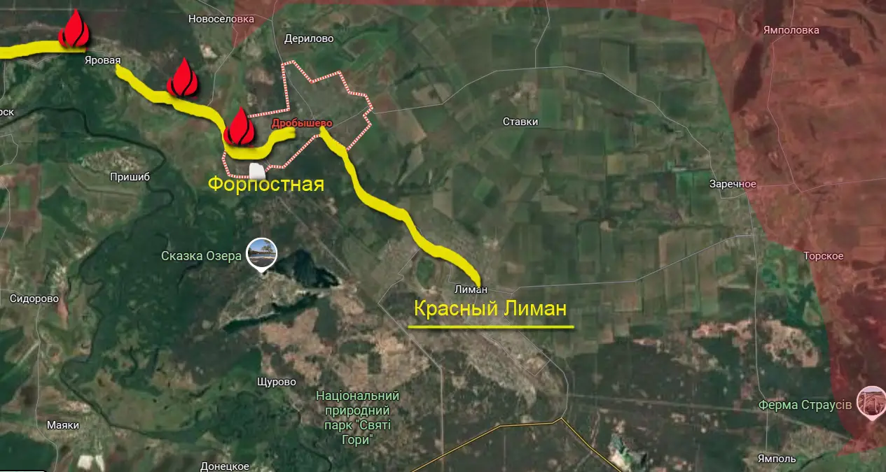 Уже сейчас российские дроноводы ежедневно наносят ущерб противнику в живой силе и технике, если тот со стороны Харьковской области через упомянутое Дробышево пытается добраться к Красному Лиману. Южнее Дробышево проходит железная дорога и находится станция с говорящим названием – Форпостная. Её потеря для ВСУ будет означать полную блокировку северо-западного маршрута снабжения как на Лиманском, так и на Северском направлениях. И российские войска сейчас заняты именно этим.
