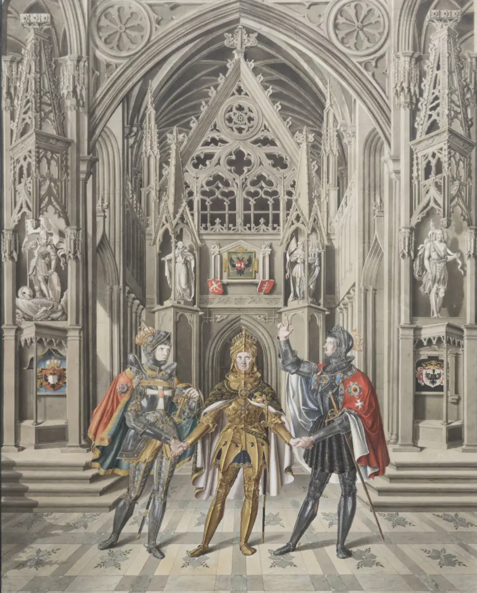 Немецкий художник Генрих Оливье. Священный союз. 1815. Представлены: император России Александр I (слева), император Австрии Франц I (в центре) и прусский король Фридрих Вильгельм III (справа), облачённые в рыцарские доспехи перед алтарём готического храма