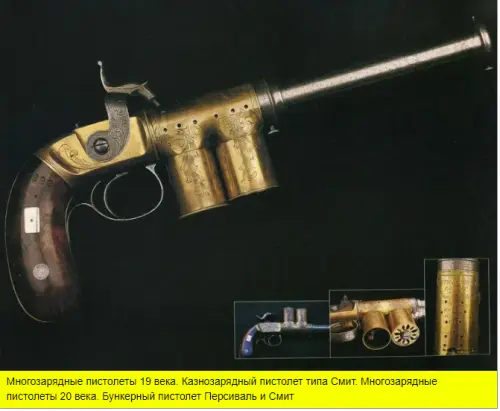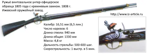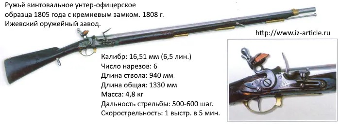 Револьвер «Смит и Вессон» калибра .44 несамовзводный, шестизарядный, известный в России как «4,2-линейный револьвер Смит и Вессона I образца». Длина ствола: 167 мм. Начальная скорость пули: 210 м/сек. Пробивное действие: на 25 шагов пробиты 3,65-дюймовые сосновые доски; на 50 шагов – 2,75, и на 100 шагов – 1 доска в 25 мм. Скорострельность: 6 выстрелов за 10 секунд. Производства Тульского оружейного завода