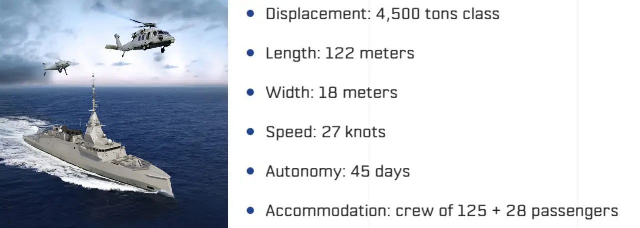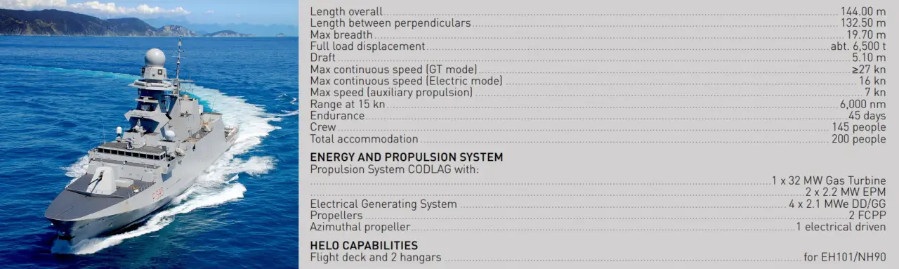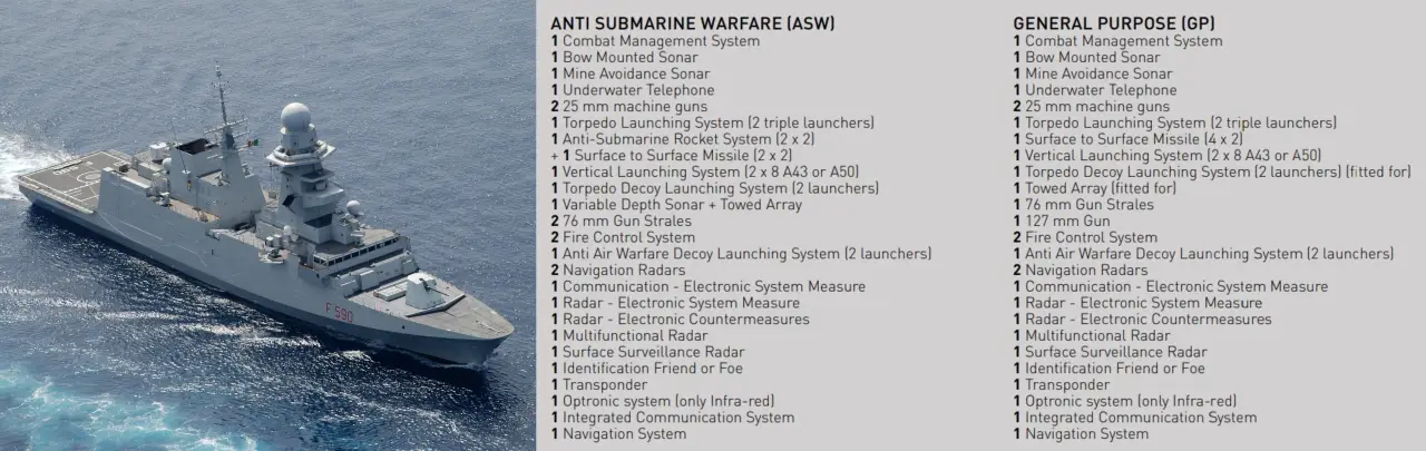 Фрегаты класса Bergamini имеют длину 144 м, водоизмещение около 6500 тонн при полной загрузке, используют малошумные дизель-генераторы и развивают скорость около 27 узлов, дальность плавания превышает 6000 морских миль. Существует два варианта комплектации: в конфигурации общего назначения, оптимизированной для нанесения ударов и патрулирования, и в противолодочном исполнении. Какая именно версия интересует Афины, пока неизвестно.