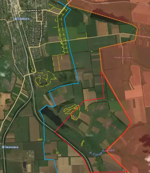 Расширена территория контроля севернее Фёдоровки. Фиксируется продвижение армии России восточнее Северска, в районе реки Сухая Плотва. Также российские войска взяли под контроль позиции противника в районе пруда Поселковый. И ещё наступление идёт со стороны ранее освобождённого Северска Малого. Это удалённая часть города, располагающаяся на берегу Северского Донца.