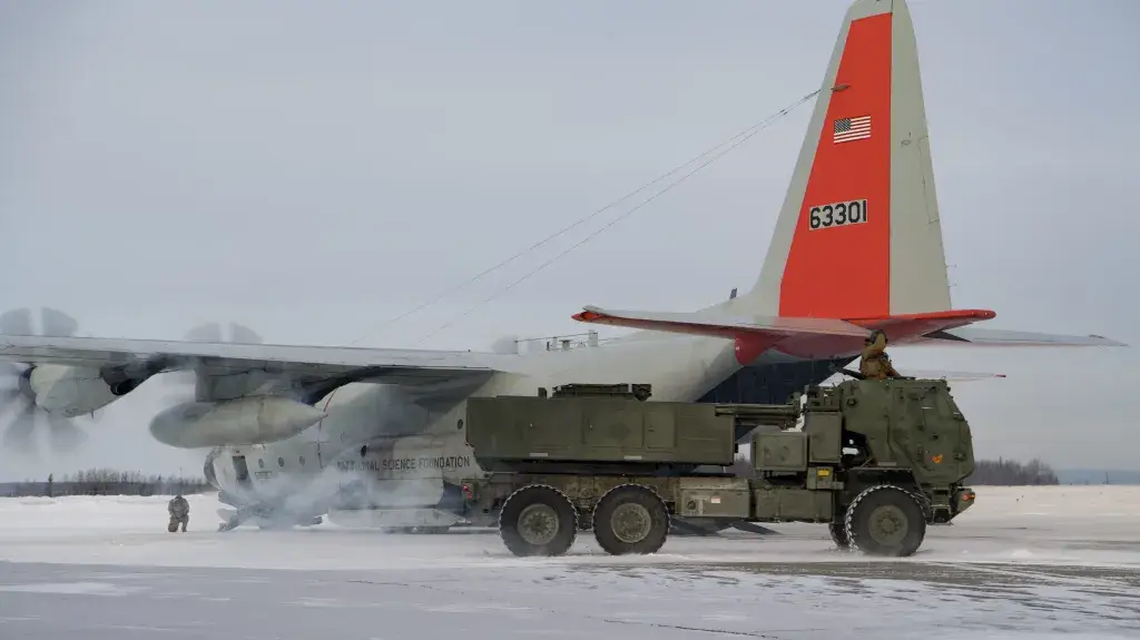Морские пехотинцы США из 5-го батальона 11-го полка морской пехоты загружают ракетную систему M142 (HIMARS) на самолёт LC-130H ВВС США, во время учений Arctic Edge Северного командования США