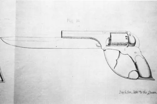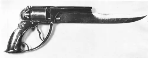 Строго говоря, это не самый первый «Кольт двойного действия», поскольку Сэмюэл Кольт уже разработал в 1841 году, когда его компания в Патерсоне находилась в упадке, револьвер со штыком двойного действия, продажи которого, как он надеялся, будут расти. Однако этот револьвер так и остался на стадии прототипа, и его существование, несомненно, осталось бы незамеченным, если бы его чертежи и единственный когда-либо изготовленный экземпляр до нас не дошли.