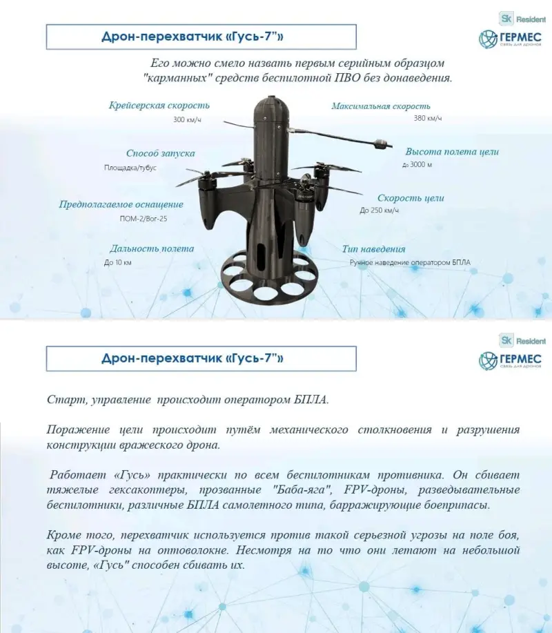 Противодроновый ПЗРК «Гермес» был впервые продемонстрирован на Всероссийском слете операторов боевых беспилотных систем «Дронница» в Великом Новгороде в начале сентября. Как заявляют разработчики, в настоящее время комплекс находится на предварительных испытаниях, отправка в зону СВО для тестирования в боевых условиях планируется до конца года.