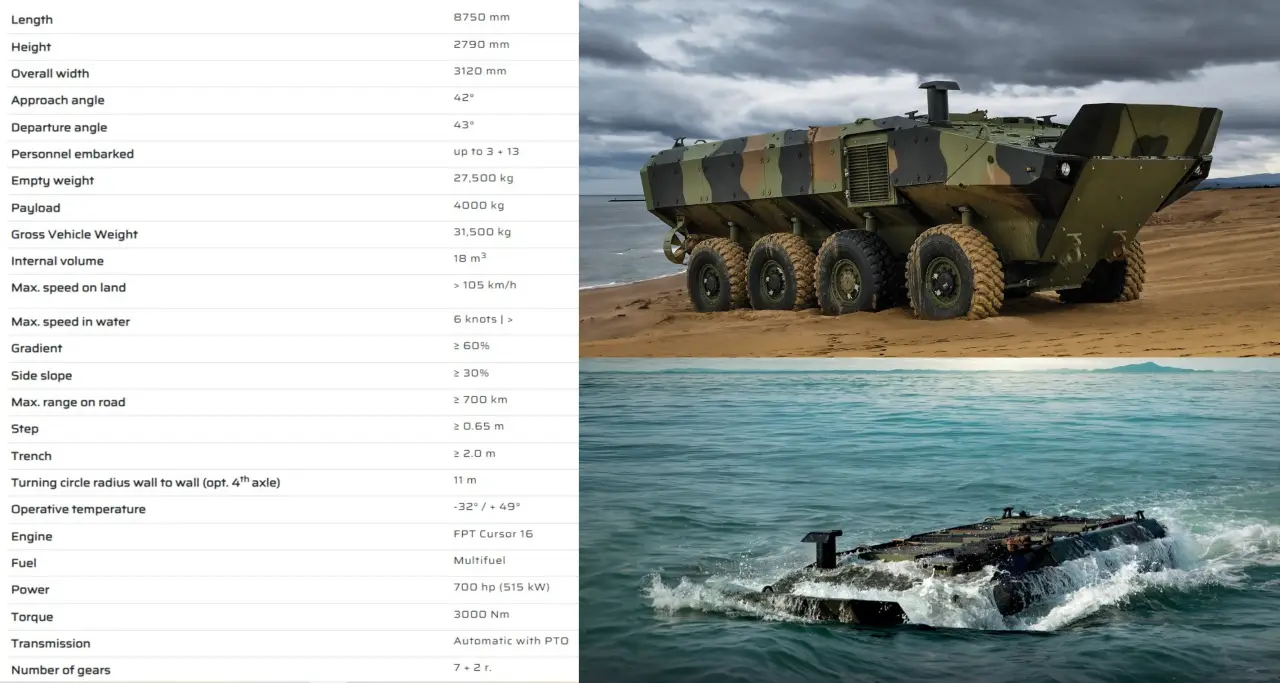 Итальянская компания IDV (из состава Iveco) раскрыла характеристики изделия VBA 8×8 (Veicolo Blindato Anfibio, «бронемашина-амфибия»), которая впервые была представлена публике 2 июня во время парада в Риме.
