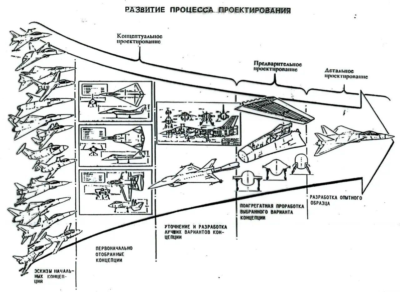В свою очередь Исполнитель пишет так называемое Техническое предложение. То есть, говорит, что он может создать в рамках озвученных желаний. Предлагает и обосновывает аэродинамическую схему самолёта, тип силовой установки и другие параметры. Ну и говорит, что да, в космос полетит, но нужен бак для окислителя и еще один двигатель, малозаметность на скорости 6М вряд ли, радиопоглощающие материалы не выдержат, лазер можно, но к нему нужна генерация мощности дополнительная. А так – все выполнимо, надо считать. Это называется «аванпроект».