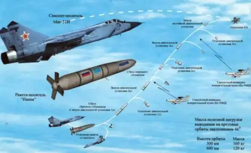 То есть, этот с позволения сказать, летательный аппарат, должен подняться на такую высоту, с которой можно оперировать неким «противоспутниковым оружием» непонятного (а автор ни слова не сказал на тему того, что это за оружие) происхождения и давать старт спутникам. То есть, заменять собой первую и вторую стартовые ступени космической ракеты-носителя.